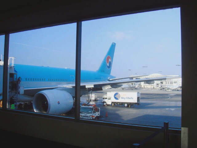 飛機起飛了,望著窗外,地平面的燈光隨著高度成了星點,而星點染了整個黑暗平面,成了金黃色,我盯著那片金黃好久好久,方才想起,飛機起飛了。座位的旁邊是一位金頭髮的年輕媽媽帶著她那一歲多的女娃飛行,那女娃漂亮極了,髮色是金黃偏淡的微卷髮,眼睛是藍綠色的,而不是她母親的棕色,小臉頰胖嘟嘟,還有一個可愛的名字:Alisa。但我對可愛小朋友的免疫力大概只有半小時,之後我獨自換到無人的座位上看著底下那片金黃,而那小女娃開始吵鬧。當窗外那片金黃消失了,取代的是一片漆黑,毫不考慮地關上窗戶,韓國漂亮的空姐發了飛行配件,藍色小包包裡面有一雙襪子、一個眼罩、一個牙刷膏,我取出眼罩,戴上眼罩,因為太疲勞而沉沉睡去。再張開眼睛是用晚餐時間。整個夜裡是呈現昏睡狀態,11小時的飛行,在我睜開眼睛只剩二個小時,看來,睡覺果然是最好打發時間的方法。