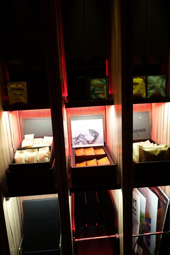 商務艙的隱私性極高,坐在自己的座位上,就很難看到前後左右在做什麼事情,喔,旁邊靠窗戶的那邊還是可以看到啦,就看到有人從扶手邊邊拿出過夜包,讓我很吃驚,原來過夜包藏在裡面。(糗)