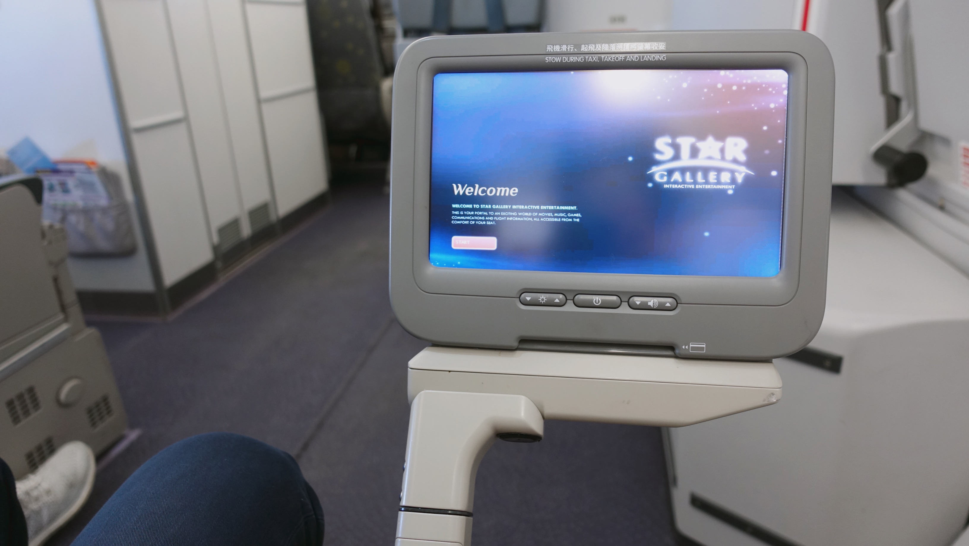 很久沒有坐第一排,發現很多東西都藏起來了,像是遙控器在扶手邊,桌子也是下摺到裡面,雜誌在旁邊的置物袋中,要費點心才能全部找到。 看到左右鄰居都在USB充電,想著我們第一排的該去哪充電?原來插座藏在椅子下方,不但有USB充電孔,還有充電插座,聽從空服人員指示,若起飛、降落時不能充電,就暫時移除,安全第一。
