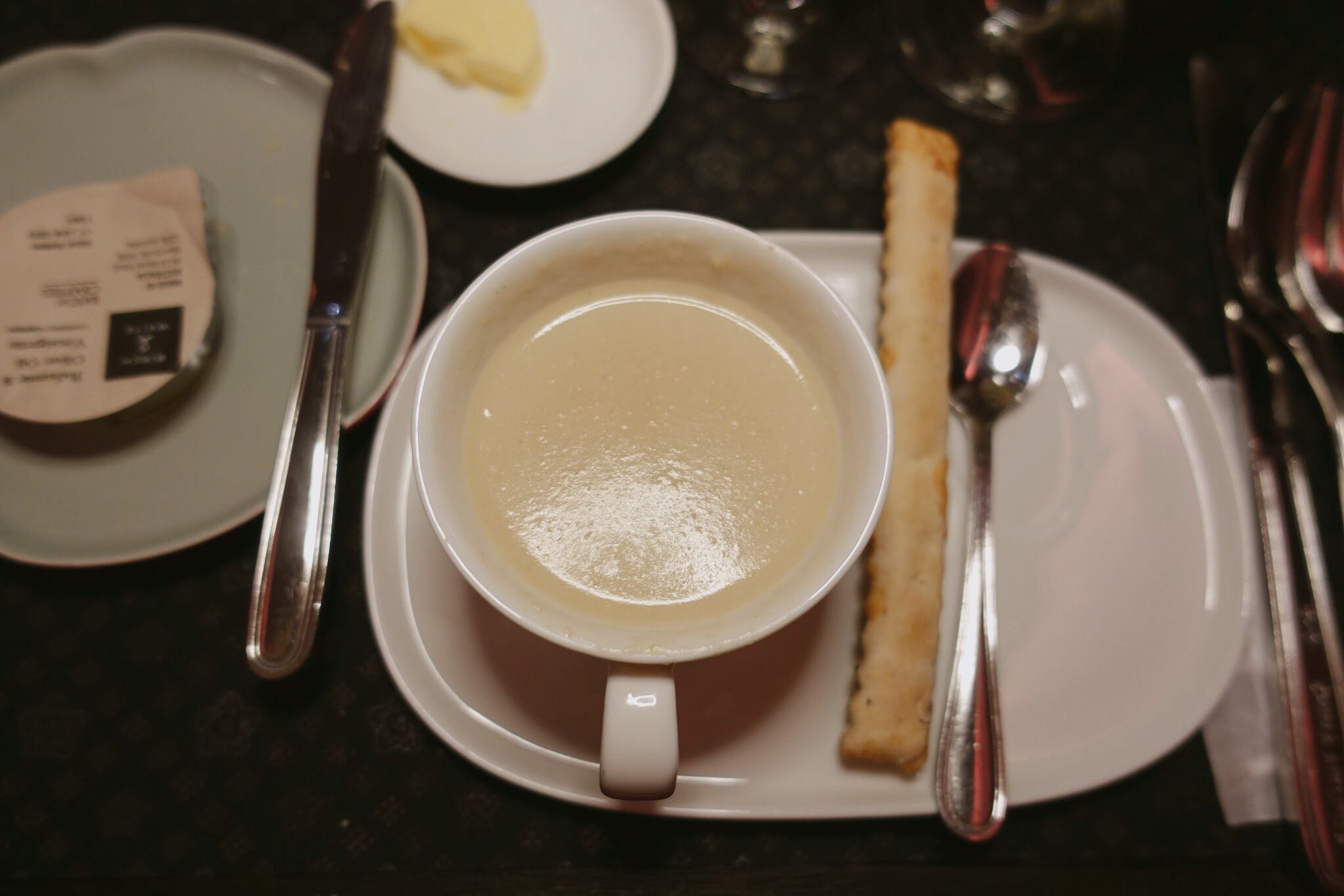 花椰菜杏仁濃湯佐起司棒,我很不喜歡杏仁,這碗湯喝不出來杏仁味,加起司棒很對味。並點了一杯熱紅茶。